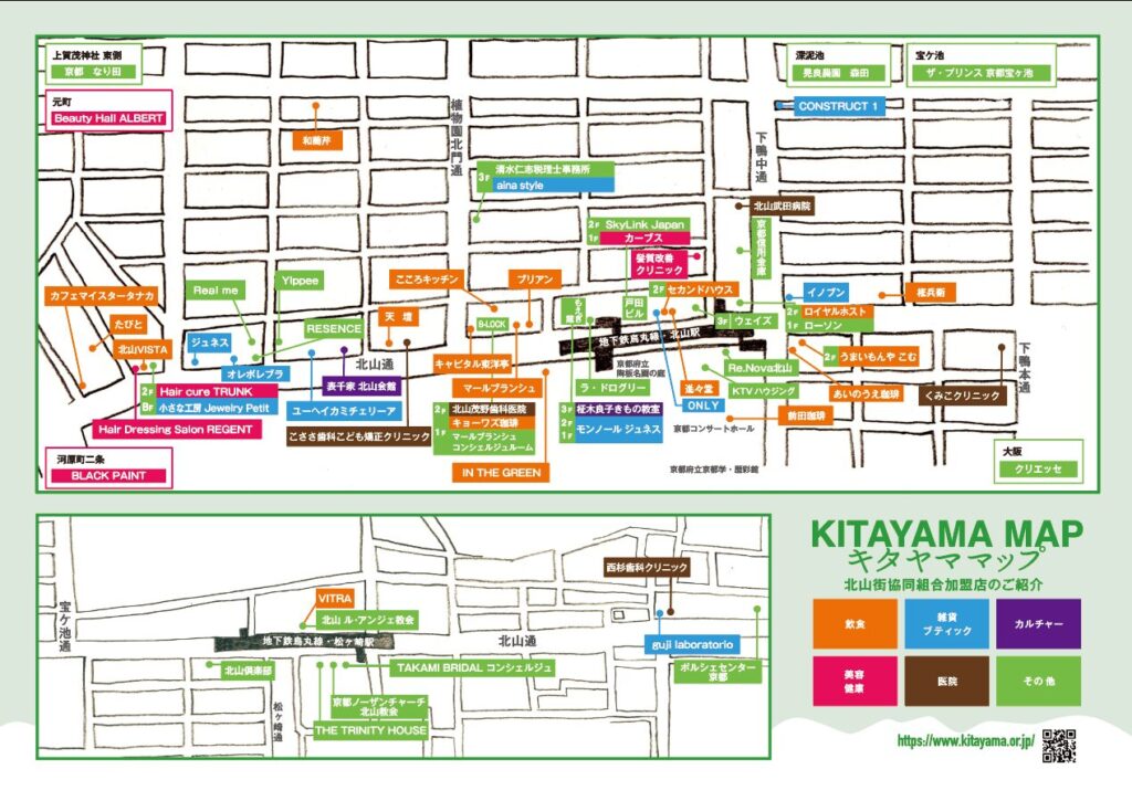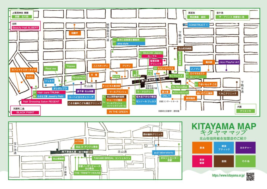 北山街協同組合が位置するエリアは、北には上賀茂神社、西には賀茂川が流れており、京都府立植物園、京都コンサートホール、京都府立京都学・歴彩館、京都府立陶板名画の庭などの文化施設、京都府立大学、ノートルダム女学院などの教育施設があります。